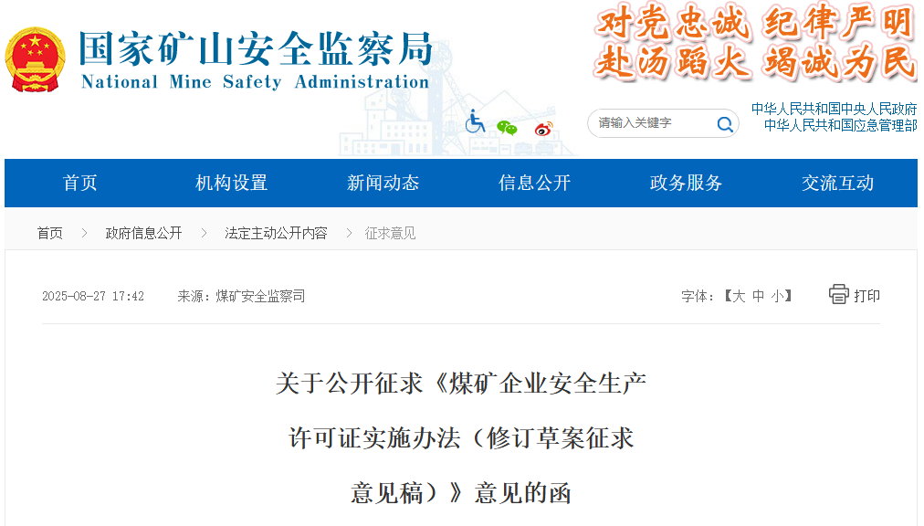 為進(jìn)一步加強(qiáng)煤礦安全生產(chǎn)許可證管理工作,國家礦山安全監(jiān)察局起草了《煤礦企業(yè)安全生產(chǎn)許可證實(shí)施辦法(修訂草案征求意見稿)》(附件1),現(xiàn)向社會(huì)公開征求意見,截止時(shí)間為2025年9月28日,請?zhí)顚憽墩髑笠庖姺答伇怼罚ǜ郊?),并發(fā)送至電子郵箱:mkaqxkz@163.com。