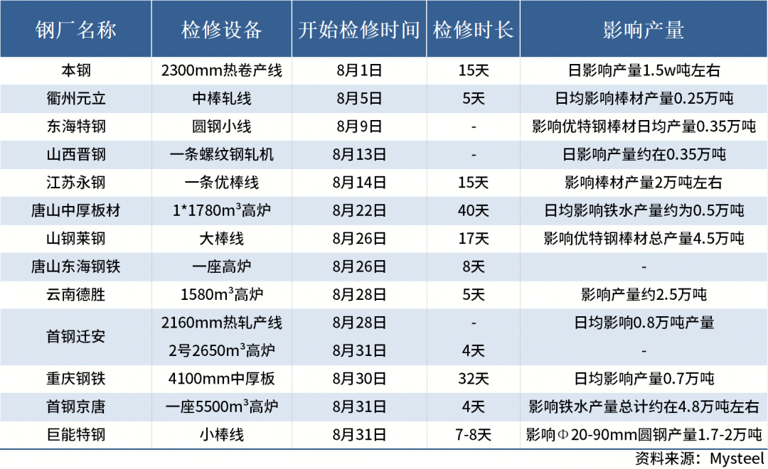 據(jù)Mysteel不完全統(tǒng)計(jì),8月以來國(guó)內(nèi)13家鋼廠發(fā)布檢修信息,其中,首鋼京唐計(jì)劃于8月31日對(duì)一座5500m3高爐進(jìn)行檢修至9月3日結(jié)束,為期4天左右,影響鐵水產(chǎn)量總計(jì)約在4.8萬噸左右。具體情況如下: