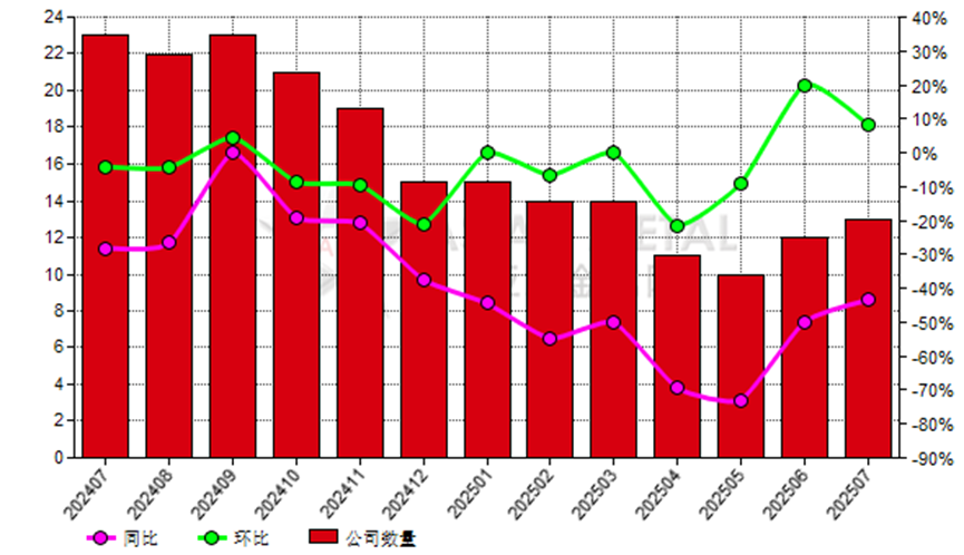 2025年1-7月,13家生產(chǎn)商共計生產(chǎn)125,300.00公噸,平均開工率5.47%。