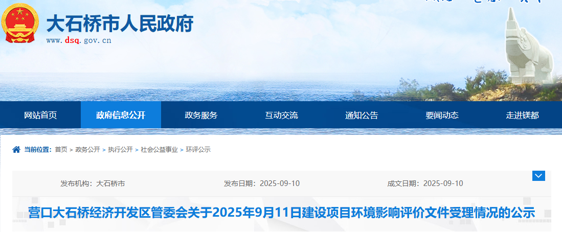 根據(jù)建設(shè)項(xiàng)目環(huán)境影響評(píng)價(jià)審批程序的有關(guān)規(guī)定,2025年9月11日我局受理1個(gè)建設(shè)項(xiàng)目環(huán)境影響評(píng)價(jià)文件。現(xiàn)將受理情況予以公示,公示期為2025年9月11日-2025年9月15日(3個(gè)工作日)。