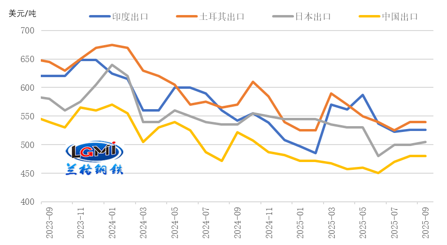 2025年8月份,我國鋼材出口同比呈微幅增長(zhǎng)態(tài)勢(shì)(詳見圖1),環(huán)比有所回落,較上月減少32.6萬噸,環(huán)比下降3.3%,鋼材進(jìn)口雖環(huán)比有所回升、同比降幅收窄,但仍處于低位水平,因而8月份我國鋼材對(duì)外貿(mào)易仍保持明顯凈出口態(tài)勢(shì),但凈出口同比增速大幅回落。蘭格鋼鐵研究中心測(cè)算數(shù)據(jù)顯示,8月份,我國凈出口鋼材901.0萬噸,同比增長(zhǎng)0.2%,增速較上月回落27.8個(gè)百分點(diǎn);1-8月份,我國凈出口鋼材7351.3萬噸,同比增長(zhǎng)11.5%,增速較上月回落1.5個(gè)百分點(diǎn)。當(dāng)前我國鋼材出口仍保持價(jià)格優(yōu)勢(shì),全球制造業(yè)指數(shù)回升,制造業(yè)外需景氣度略有改善,鋼鐵企業(yè)出口訂單指數(shù)回升至擴(kuò)張區(qū)間,短期內(nèi)對(duì)鋼材出口有一定拉動(dòng);但全球粗鋼產(chǎn)量有所回升,疊加貿(mào)易摩擦及相關(guān)稅費(fèi)增加仍將抑制鋼材出口。在上年同期鋼材出口基數(shù)繼續(xù)增加(2024年9月鋼材出口1015萬噸)的情況下,9月份我國鋼材出口同比或面臨回落壓力。相關(guān)影響因素分析如下:1、我國鋼鐵出口價(jià)格優(yōu)勢(shì)仍存當(dāng)前我國鋼材出口價(jià)格優(yōu)勢(shì)仍存。蘭格鋼鐵研究中心監(jiān)測(cè)數(shù)據(jù)顯示,截至2025年9月8日,印度、土耳其、日本熱軋卷板出口報(bào)價(jià)(FOB)分別為525美元/噸、540美元/噸和505美元/噸,中國熱軋卷板出口報(bào)價(jià)(FOB)為480美元/噸;目前我國熱卷出口報(bào)價(jià)分別較印度、土耳其、日本低45美元/噸、60美元/噸和25美元/噸(詳見圖2)。