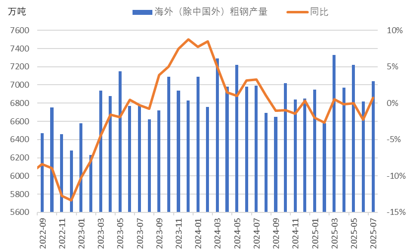 2、海外鋼鐵供應(yīng)由降轉(zhuǎn)升,我國鋼材出口空間有所抑制2025年7月份全球粗鋼產(chǎn)量繼續(xù)呈現(xiàn)同比下降態(tài)勢(shì)。7月全球70個(gè)納入世界鋼鐵協(xié)會(huì)統(tǒng)計(jì)國家的粗鋼產(chǎn)量為1.501億噸,同比下降1.3%。從中國以外粗鋼產(chǎn)量來看,同比由降轉(zhuǎn)升,蘭格鋼鐵研究中心監(jiān)測(cè)數(shù)據(jù)顯示,7月份,中國以外全球其他地區(qū)產(chǎn)量為7040萬噸,同比增長(zhǎng)0.7%(詳見圖3)。海外供應(yīng)由降轉(zhuǎn)升,我國鋼材外部需求空間有所抑制。