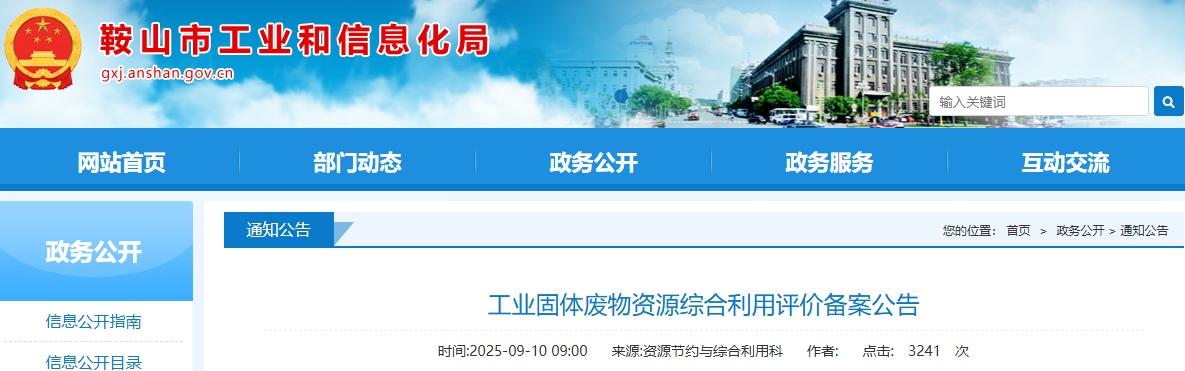 按照工信部《工業(yè)固體廢物資源綜合利用評(píng)價(jià)管理暫行辦法》、《國(guó)家工業(yè)固體廢物資源綜合利用產(chǎn)品目錄》、省工信廳《遼寧省工業(yè)和信息化廳關(guān)于做好工業(yè)固體廢物資源綜合利用評(píng)價(jià)工作的通知》(遼工信資源〔2023〕129號(hào))及《鞍山市工業(yè)固體廢物資源綜合利用評(píng)價(jià)管理實(shí)施辦法》要求,2025年9月3日-2025年9月9日,我局對(duì)鞍山廈美環(huán)??萍加邢薰尽吧疥煌ㄐ虏牧嫌邢薰?、鞍鋼綠色資源科技有限公司工業(yè)固體廢物綜合利用評(píng)價(jià)進(jìn)行備案公示。截至公示期結(jié)束,未收到不同意見(jiàn),現(xiàn)予以公布。