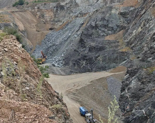 結(jié)束第一處現(xiàn)場處置下山途中,帶隊(duì)負(fù)責(zé)人又觀察到對面山上有可疑的大型車輛通行痕跡,在沿一條岔路上山途中,發(fā)現(xiàn)路上水泥地殘留的黑色大型輪胎印,立即帶領(lǐng)監(jiān)察員循跡追蹤。步行至山頂發(fā)現(xiàn),一個(gè)廢石傾倒場地赫然出現(xiàn),鏟車和運(yùn)礦車正在邊坡傾倒廢石。監(jiān)察人員跟隨這輛運(yùn)礦車,最終發(fā)現(xiàn)一個(gè)作業(yè)條件極其危險(xiǎn)的深坑開采點(diǎn),坑內(nèi)有挖掘機(jī)、運(yùn)礦車正在裝車作業(yè),附近還停放一臺專業(yè)鑿巖臺車。