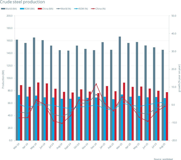 2025年8月全球70個納入世界鋼鐵協(xié)會統(tǒng)計國家/地區(qū)的粗鋼產(chǎn)量為1.453億噸,同比提高0.3%。