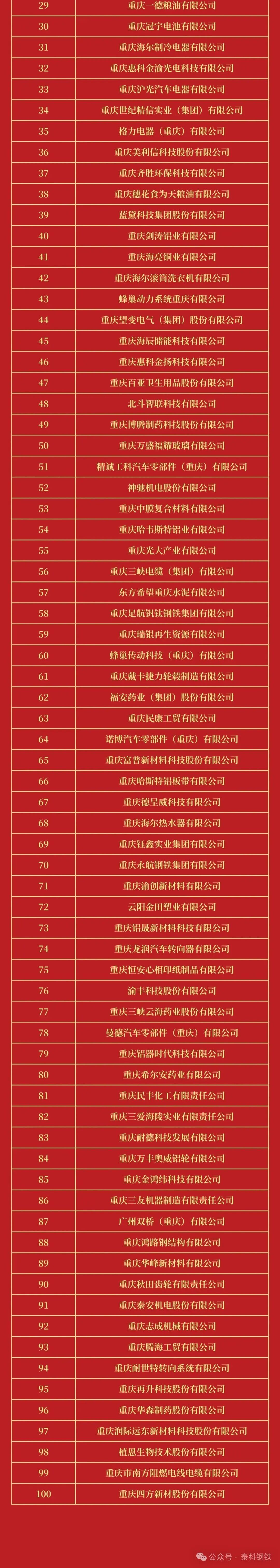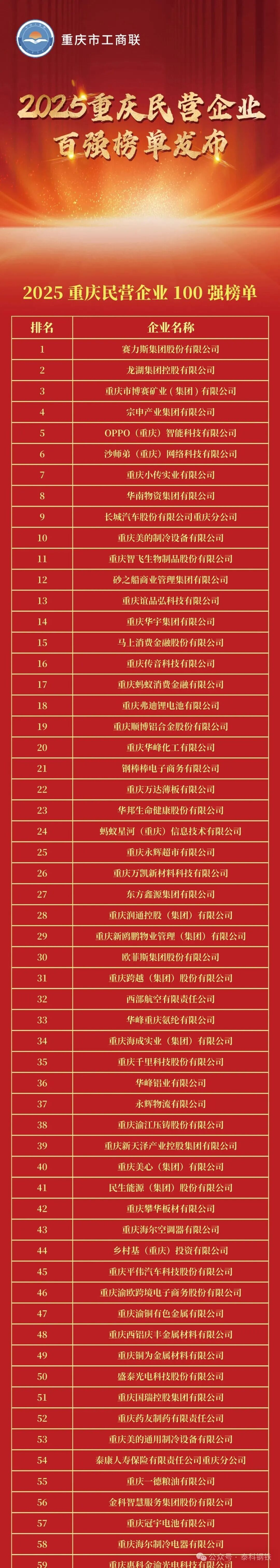 9月19日,重慶市工商聯(lián)、市發(fā)改委、市經(jīng)信委舉辦“2025重慶民營(yíng)企業(yè)100強(qiáng)發(fā)布會(huì)”會(huì)上,2025重慶民營(yíng)企業(yè)100強(qiáng)和2025重慶制造業(yè)民營(yíng)企業(yè)100強(qiáng)榜單正式發(fā)布。鋼鐵、冶金行業(yè),賽博礦業(yè)、萬(wàn)達(dá)薄板、攀華板材等上榜民營(yíng)企業(yè)100強(qiáng),足航釩鈦鋼鐵、永航鋼鐵集團(tuán)等上榜制造業(yè)民營(yíng)企業(yè)100。