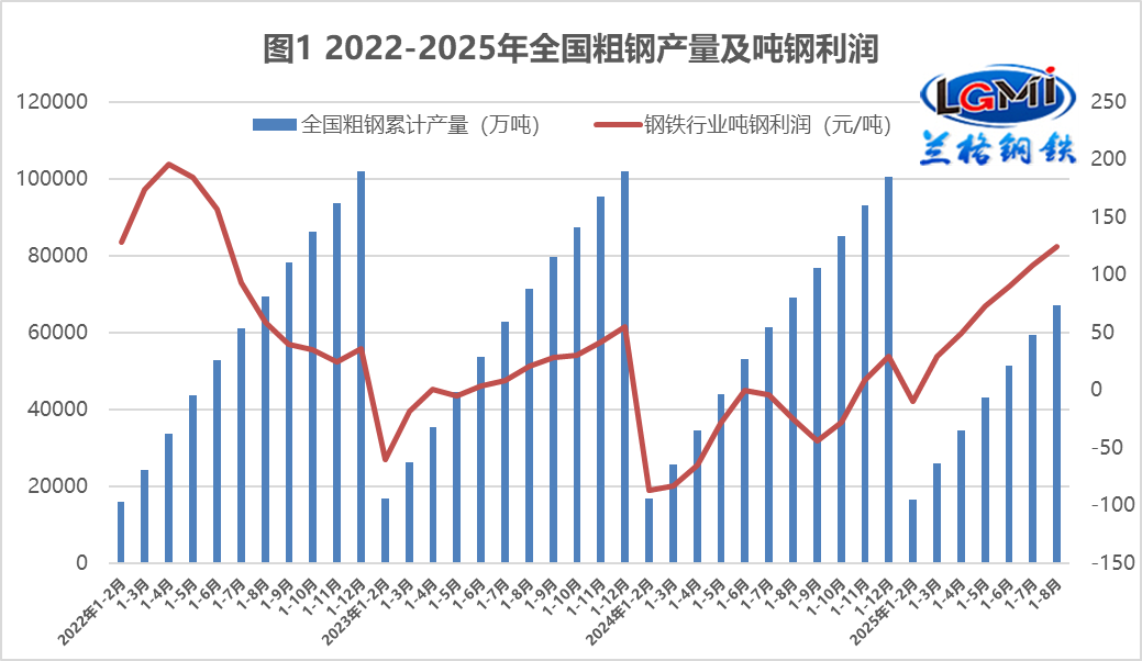 8月份,在經(jīng)濟(jì)運(yùn)行穩(wěn)中有進(jìn)、限產(chǎn)政策逐步落實、淡季效應(yīng)持續(xù)突顯、成本支撐維持韌性的影響下,國內(nèi)鋼鐵市場呈現(xiàn)了震蕩走弱的行情,但由于原料成本持續(xù)下降,使得鋼鐵行業(yè)的盈利空間持續(xù)擴(kuò)大。根據(jù)國家統(tǒng)計局發(fā)布數(shù)據(jù)顯示,2025年1-7月黑色金屬冶煉和壓延加工業(yè)盈利643.6億元,同比增長5175.4%。從月度數(shù)據(jù)來看,1-2月鋼鐵行業(yè)虧損15.5億元,3月份鋼鐵行業(yè)盈利90.6億元,4月份鋼鐵行業(yè)盈利94.1億元,5月份鋼鐵行業(yè)盈利147.7億元,6月份鋼鐵行業(yè)盈利145.9億元,7月份鋼鐵行業(yè)盈利180.8億元,8月份鋼鐵行業(yè)盈利193.4億元,環(huán)比增加12.6億元。