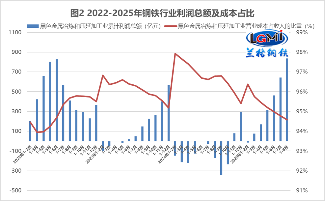 從全國粗鋼產(chǎn)量及噸鋼利潤的數(shù)據(jù)來看,2025年1-8月國內(nèi)鋼鐵生產(chǎn)企業(yè)處于“控產(chǎn)擴(kuò)利”的局面,噸鋼盈利125元,較上年同期增加150元(詳見圖1)。從營業(yè)成本來看,1-8月環(huán)比持續(xù)下降,但仍處相對高位,1-8月營業(yè)成本占營業(yè)收入的比重為94.6%,較上年同期下降2.2個百分點(diǎn)(詳見圖2)。從鋼企利潤率來看,1-8月鋼企盈利能力持續(xù)增強(qiáng),成本利潤率為1.74%,較上年同期上升2.08個百分點(diǎn);銷售利潤率為1.65%,較上年同期上升1.97個百分點(diǎn)(詳見圖3)。