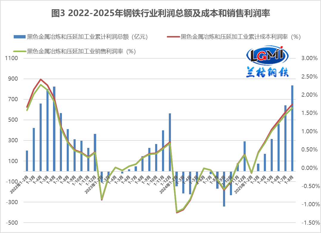 據(jù)國家統(tǒng)計局?jǐn)?shù)據(jù)顯示,2025年1-8月份,黑色金屬冶煉和壓延加工業(yè)實現(xiàn)營業(yè)收入50799.8億元,同比下降5.3%;營業(yè)成本48046.9億元,同比下降7.5%;利潤總額837.0億元,同比由虧轉(zhuǎn)盈。蘭格點(diǎn)評