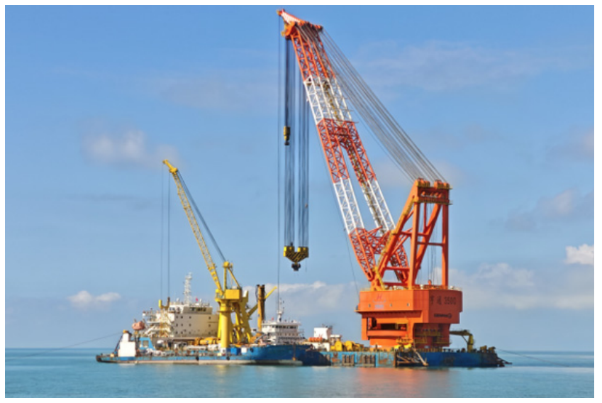 圖為龍?jiān)措娏D蠔|方海上風(fēng)電項(xiàng)目單樁基礎(chǔ)施工