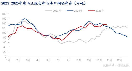 調(diào)研截止至10月23日鋼坯倉儲庫存總量達150.74萬噸,較上周小幅增加0.29萬噸。從區(qū)域分布來看,唐山地區(qū)庫存占比最高,達134.13萬噸;天津地區(qū)為0.4萬噸,江蘇地區(qū)則為16.21萬噸。2025年全國鋼坯社會庫存整體呈現(xiàn)“南低北高”格局,庫存去化節(jié)奏緩慢,市場整體承壓明顯,其中唐山市場的社會庫存占比較高。以唐山市場為例,2025年鋼坯庫存隨季節(jié)與需求變化呈現(xiàn)明顯波動:春節(jié)臨近下游調(diào)坯廠逐步進入假期,市場需求持續(xù)走弱,鋼坯庫存進入累庫周期,春節(jié)期間日均累庫量約1.9萬噸。春節(jié)后下游調(diào)坯廠利潤改善,開工率與產(chǎn)能利用率同步提升,帶動鋼坯需求增長,社會庫存隨之下降。從庫存周期看,2025年上半年鋼坯市場呈現(xiàn)典型的“主動去庫”特征:貿(mào)易商基于謹慎預期維持低庫存,供應緊張則強化了這一趨勢。進入下半年,市場轉(zhuǎn)向“被動累庫”,其核心驅(qū)動力是下游利潤惡化引發(fā)的需求收縮,導致鋼坯在需求不暢中持續(xù)積壓。