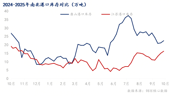 唐山港口鋼坯庫存22.45萬噸,周環(huán)比增加1.3萬噸,較上月同期減少4.6萬噸,較去年同減少5.13萬噸。華東地區(qū)主流港口鋼坯庫存16.21萬噸,周環(huán)比增加1.22萬噸,較上月同期增加5.06萬噸,較去年同減少3.58萬噸。從目前來看,南北港口本周均呈“周環(huán)比增長”,短期累庫屬于區(qū)域供需節(jié)奏性調(diào)整,并非趨勢性壓力。中長期來看北方唐山港口庫存供需結構更優(yōu),庫存壓力持續(xù)緩解;華東港口雖年度壓力減輕,但本月需求釋放弱于北方,短期庫存消化壓力略高于唐山。