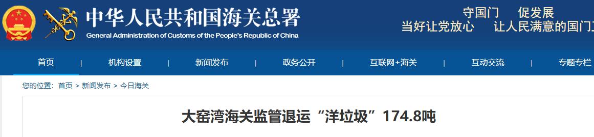 近日,在大連海關(guān)所屬大窯灣海關(guān)監(jiān)管下,174.8噸“洋垃圾”在大窯灣港碼頭裝船退運(yùn)出境。