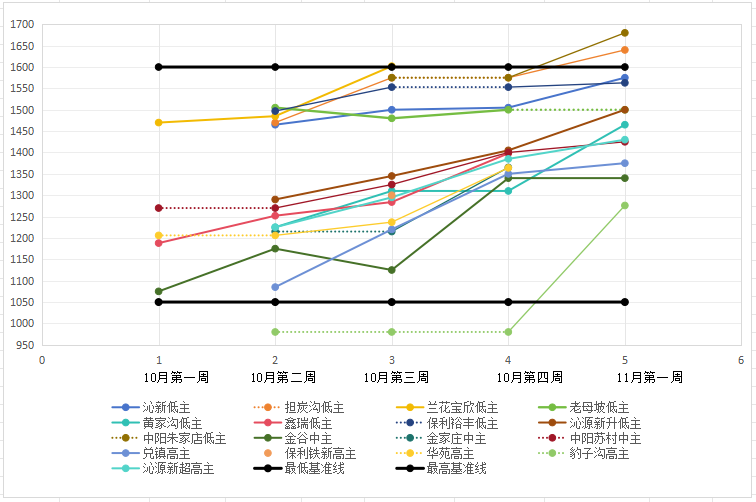 第三階段(10月第四周 - 11月第一周):呈現(xiàn)“高位沖刺” 態(tài)勢(shì),如沁新低硫主焦?jié)q至1575元/噸;中陽朱家店低硫主焦沖至1680 元/噸;擔(dān)炭溝低硫主焦從1575元/噸躍升至1640元/噸;豹子溝高硫主焦從980元/噸沖至1276元/噸。