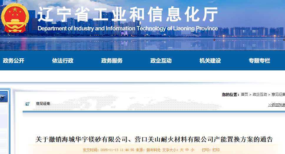 關(guān)于撤銷(xiāo)海城華宇鎂砂有限公司、營(yíng)口關(guān)山耐火材料有限公司產(chǎn)能置換方案的通告2025年6月19日、10月10日,我廳分別對(duì)海城華宇鎂砂有限公司、營(yíng)口關(guān)山耐火材料有限公司新建輕燒氧化鎂項(xiàng)目產(chǎn)能置換方案進(jìn)行了通告。