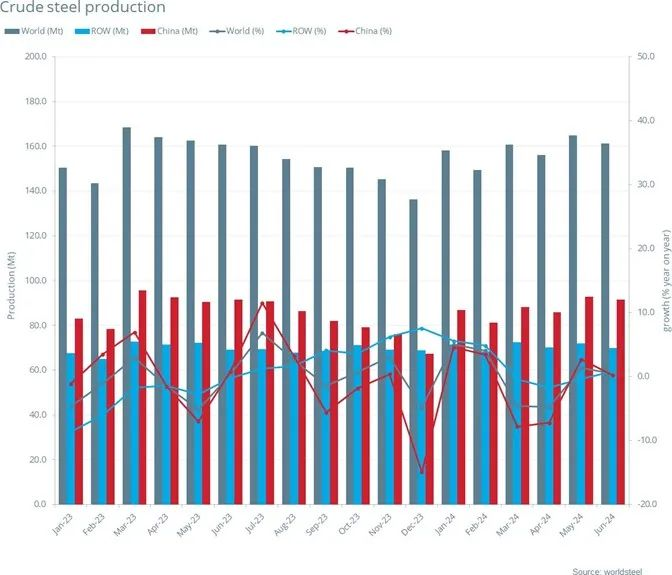 2024年6月全球71個(gè)納入世界鋼鐵協(xié)會(huì)統(tǒng)計(jì)國(guó)家的粗鋼產(chǎn)量為1.614億噸,同比提高0.5%。