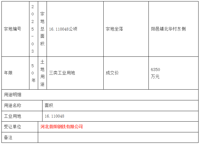 近日,河北普陽(yáng)鋼鐵有限公司以6350萬(wàn)元成功競(jìng)得武安市陽(yáng)邑鎮(zhèn)北華村東側(cè)一宗工業(yè)用地,總面積達(dá)16.110048公頃,使用年限50年。該地塊通過(guò)公開(kāi)掛牌方式出讓,符合《中華人民共和國(guó)土地管理法》等相關(guān)法規(guī)要求。