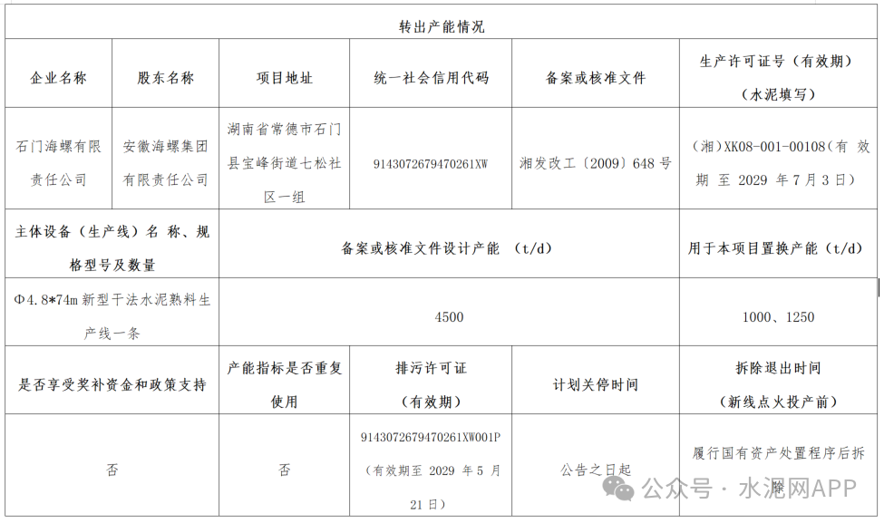 置換方案顯示,石門(mén)海螺水泥退出一條4500t/d熟料生產(chǎn)線(xiàn),其中1000t/d產(chǎn)能用于補(bǔ)充英德海螺3#線(xiàn),補(bǔ)充后產(chǎn)能6000t/d;1250t/d用于1#線(xiàn),補(bǔ)充后產(chǎn)能5750t/d,置換比例2:1。