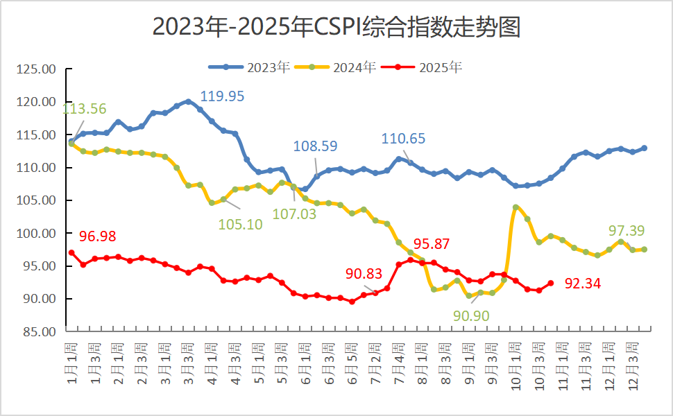 1-10月份,CSPI平均值為93.50點(diǎn),同比下降9.91點(diǎn),降幅為9.58%。