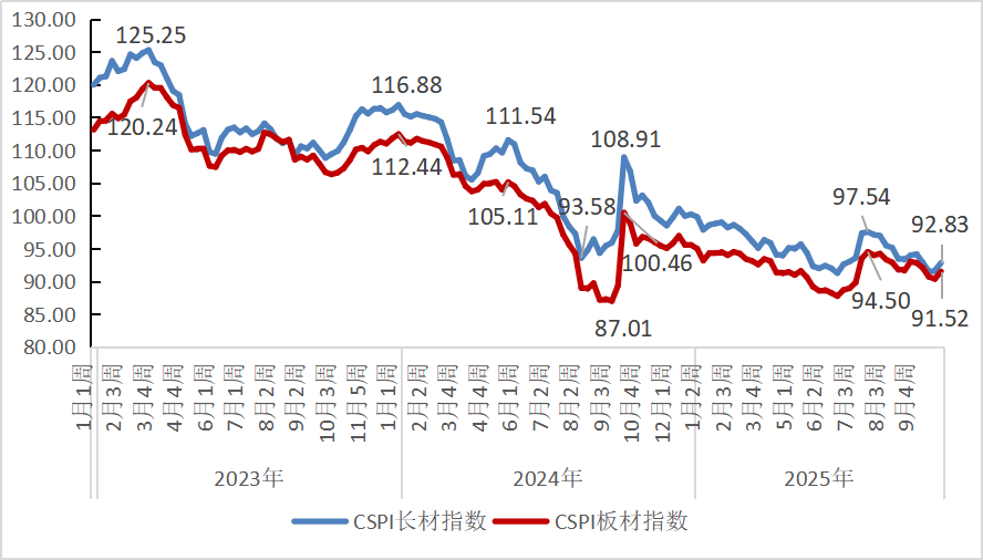 截至2025年10月末,CSPI長(zhǎng)材指數(shù)為92.83點(diǎn),環(huán)比下降1.33點(diǎn),降幅為1.41%;CSPI板材指數(shù)為91.52點(diǎn),環(huán)比下降1.31點(diǎn),降幅為1.41%;與上年同期相比,CSPI長(zhǎng)材、板材指數(shù)分別下降10.27點(diǎn)和下降5.26點(diǎn),分別下降9.96%和5.44%。