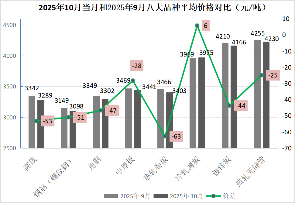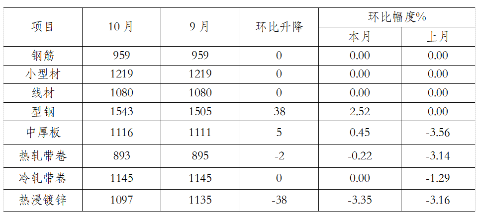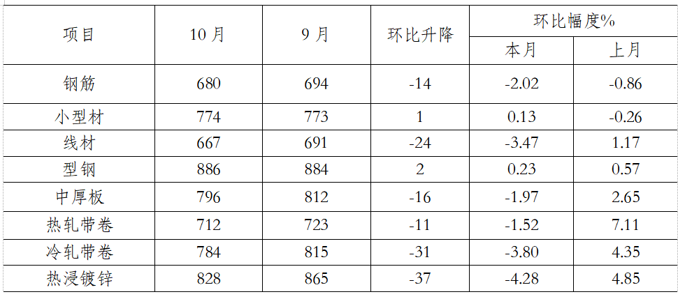 10月份,監(jiān)測(cè)的八大鋼材品種中,除冷軋薄板外主要鋼材品種平均價(jià)格均下降。其中,熱軋卷板價(jià)格下降較大,下降63元/噸;無(wú)縫管小幅下降,平均價(jià)格下降25元/噸。(見下表)
