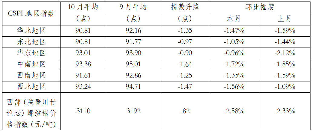 CSPI分地區(qū)鋼材價(jià)格指數(shù)變化情況表