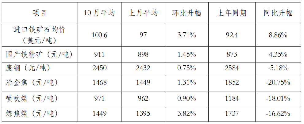 從原燃料來(lái)看,與9月相比,主要原燃料各品種平均價(jià)格均上升。其中,煉焦煤漲幅較大,為3.82%,廢鋼漲幅較小,為0.75%,原燃料對(duì)鋼價(jià)的支撐作用有所增強(qiáng)。(見下表)