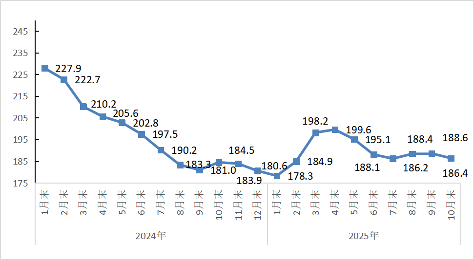 2025年10月份,CRU國(guó)際鋼材價(jià)格指數(shù)為186.4點(diǎn),環(huán)比下降2.2點(diǎn),降幅為1.2%;同比上升1.9點(diǎn),同比升幅為1.0 %。(見下圖)