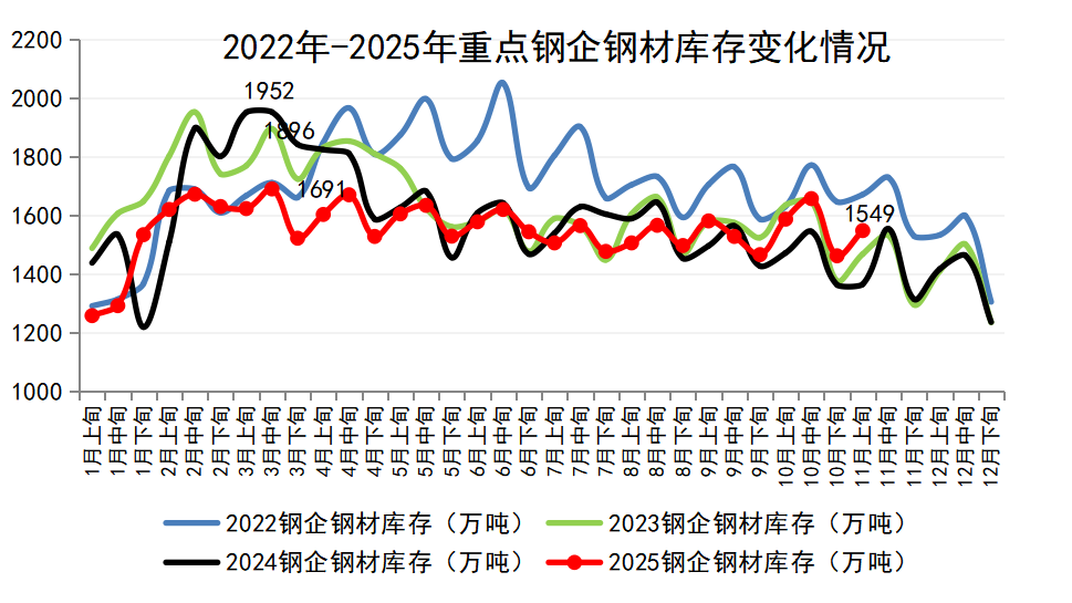 從企業(yè)庫(kù)存來(lái)看,11月上旬重點(diǎn)鋼企鋼材庫(kù)存位于近三年歷史同期高位。2025年11月上旬重點(diǎn)鋼鐵企業(yè)鋼材庫(kù)存量為1549萬(wàn)噸,旬環(huán)比增加86萬(wàn)噸,上升5.9%;比上月同旬減少39萬(wàn)噸,下降2.5%;比去年同旬增加183萬(wàn)噸,上升13.4%。