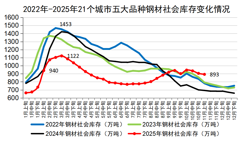 回顧上半年鋼材市場(chǎng)表現(xiàn):1至2月份,鋼材市場(chǎng)在淡季效應(yīng)、冬儲(chǔ)博弈等因素影響下區(qū)間震蕩運(yùn)行。3月份,在美國(guó)挑起關(guān)稅戰(zhàn)、原燃料價(jià)格弱勢(shì)運(yùn)行等背景下,鋼材價(jià)格弱勢(shì)震蕩,總體小幅下行。4月份,在外部沖擊不斷加大、需求回暖但不及預(yù)期影響下,鋼材價(jià)格延續(xù)震蕩下行趨勢(shì)。5至6月份,鋼材市場(chǎng)在需求不足、特朗普關(guān)稅政策影響、供需矛盾逐漸累積背景下,價(jià)格繼續(xù)下行,至6月末,國(guó)內(nèi)鋼材綜合價(jià)格指數(shù)跌破90點(diǎn),達(dá)到89.51點(diǎn),為2016年11月底以來(lái)新低水平。7月份,鋼材市場(chǎng)在“反內(nèi)卷”政策預(yù)期下呈現(xiàn)大幅上行態(tài)勢(shì)。8-9月份,鋼材市場(chǎng)在需求恢復(fù)不及預(yù)期、庫(kù)存壓力逐步加大的背景下震蕩下行,進(jìn)入10月份,國(guó)內(nèi)鋼材市場(chǎng)延續(xù)震蕩下行趨勢(shì),10月末鋼價(jià)雖有小幅回升但整體仍呈震蕩下行趨勢(shì),進(jìn)入11月份,受淡季效應(yīng)影響,需求快速下降,鋼價(jià)回歸偏弱的基本面,呈現(xiàn)震蕩偏弱運(yùn)行態(tài)勢(shì)。(見下表)