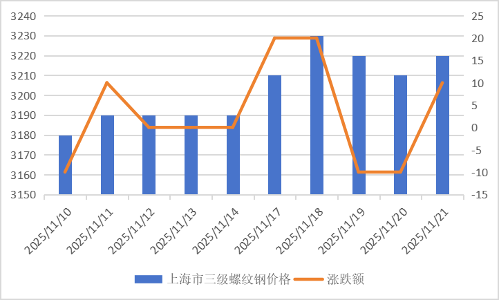 上海市三級螺紋鋼價格在3210-3230元/噸的極窄區(qū)間內(nèi)波動,周一、二連續(xù)兩日小幅上漲20元,累計至周內(nèi)高點3230元,周三、四價格未能守住漲幅,連續(xù)兩日各下跌10元,回落至3210元,周五在連跌兩日后小幅反彈10元,收于3220元。當價格跌近3210元低位時,鋼企的原料成本形成“地板”,阻止其進一步下跌,而價格上漲時,下游接受度低,采購方按需購買,導致價格無力突破上行。