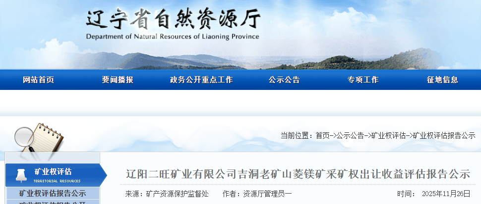 遼陽二旺礦業(yè)有限公司吉洞老礦山菱鎂礦采礦權(quán)出讓收益評(píng)估報(bào)告通過遼寧省自然資源廳門戶網(wǎng)站向社會(huì)公示,公示10個(gè)工作日。如有異議,請(qǐng)于公示之日起10個(gè)工作日內(nèi)以電話方式先向省自然資源廳礦產(chǎn)資源保護(hù)監(jiān)督處提出簡要意見,隨后及時(shí)將書面意見反饋到省自然資源廳礦產(chǎn)資源保護(hù)監(jiān)督處。