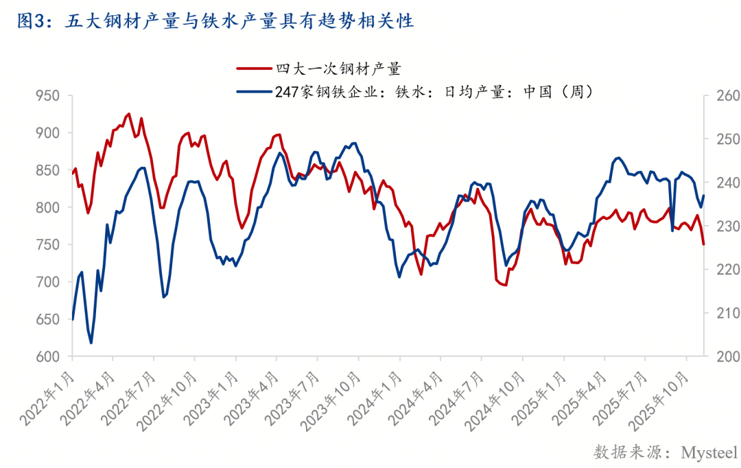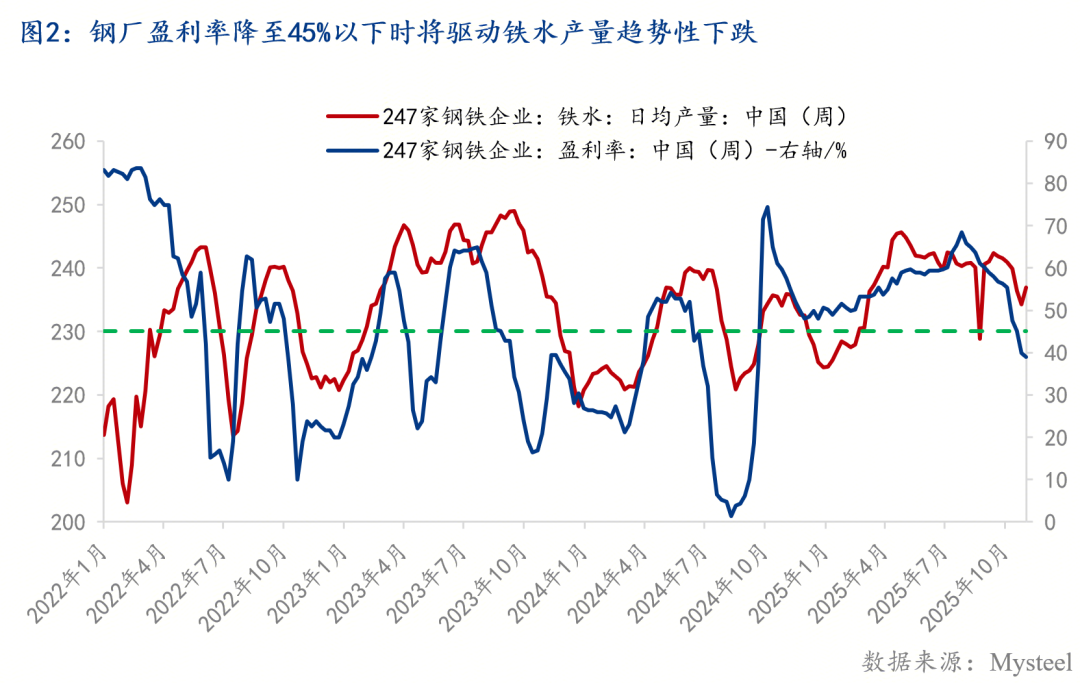 當(dāng)前鋼市運行的核心邏輯是負(fù)反饋,根源在于需求淡季下的鋼材去庫壓力,而歷史上鋼市負(fù)反饋行情多發(fā)生在“金三銀四”及“金九銀十”旺季,最根本原因是旺季鋼材去庫不及預(yù)期。歷史規(guī)律顯示,鋼材去庫拐點通常比鋼廠盈利率拐點提前15-30天,核心邏輯是:旺季初期去庫乏力矛盾未顯現(xiàn),鋼廠盈利仍上升;后期去庫乏力引發(fā)市場對供應(yīng)過剩的判斷,進(jìn)而通過打壓利潤倒逼鋼廠減產(chǎn)。鋼市負(fù)反饋觸發(fā)的根本條件是旺季鋼材庫存去化不及預(yù)期,而利潤水平則是決定鋼廠是否減產(chǎn)的直接原因——庫存去化不及預(yù)期會導(dǎo)致鋼廠盈利率下降,降至一定水平后鋼廠將通過減產(chǎn)緩解供應(yīng)壓力。2022年以來的歷史經(jīng)驗顯示,當(dāng)鋼市供過于求、庫存去化乏力時,打壓鋼廠利潤倒逼減產(chǎn)是唯一緩解矛盾的途徑,且存在明確規(guī)律:鋼廠盈利率拐點領(lǐng)先鐵水拐點約兩個月,盈利率降至45%以下鐵水產(chǎn)量才會趨勢下跌,降至10%-25%中樞水平鐵水產(chǎn)量才見底。鋼市負(fù)反饋的核心目標(biāo)是通過倒逼鋼廠減產(chǎn),緩解供應(yīng)過剩導(dǎo)致的鋼材庫存去化乏力問題,評估減產(chǎn)程度的關(guān)鍵指標(biāo)為Mysteel247家日均鐵水產(chǎn)量(與五大鋼材產(chǎn)量存在趨勢相關(guān)性,且今年以來比值均值約為1.93)。以2022-2023年國慶節(jié)后(與今年同期庫存高點相當(dāng)、去庫節(jié)奏雷同)的去庫表現(xiàn)為參考,從去庫速率(今年21萬噸/周vs兩年均值46萬噸/周)和去庫降幅(今年8%vs兩年均值17%)兩個維度進(jìn)行推算,結(jié)論便是鐵水產(chǎn)量均需從國慶后高點242萬噸/日降至200萬噸/日左右,才能實現(xiàn)去庫節(jié)奏趨同;然而當(dāng)前鐵水產(chǎn)量在236萬噸/日,理論上仍有36萬噸減產(chǎn)空間。理論推算的鐵水平衡低點200萬噸/日,低于過去四年負(fù)反饋行情下的鐵水最低值213萬噸/日,凸顯今年國慶后鋼材庫存去化動能極度羸弱。但Mysteel排產(chǎn)調(diào)研顯示,未來鐵水低點或在228-230萬噸/日,與理論值存在差距,核心原因在于鋼廠盈利水平。因此,后續(xù)需重點跟蹤鋼廠盈利變化,這是影響減產(chǎn)落地程度及庫存去化進(jìn)程的關(guān)鍵因素。