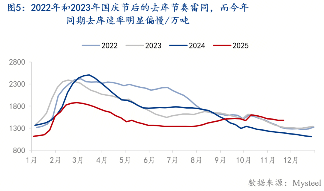 由于今年國慶節(jié)后,五大鋼材總庫存高點與2022年、2023年的同期水平相當(dāng),且2022年和2023年國慶節(jié)后的五大鋼材去庫節(jié)奏雷同(如下圖5),因此我們通過錨定這兩年國慶節(jié)后的去庫節(jié)奏,來判斷今年國慶節(jié)后五大鋼材去庫是否健康。