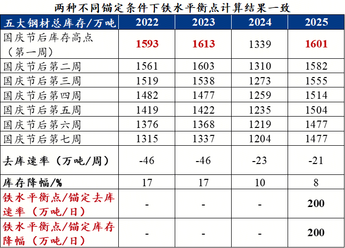 首先,從庫存去庫速率的角度來看:經(jīng)過計算,今年國慶節(jié)后五大鋼材總庫存從高點1601萬噸降至當(dāng)前水平1477萬噸的過程中,其去庫速率為21萬噸/周;然而,2022年同期去庫速率為46萬噸/周,2023年同樣為46萬噸/周,因此這兩年的去庫速率均值在46萬噸/周??梢钥吹浇衲陣鴳c節(jié)后的去庫速率要少了26萬噸/周,也就說五大鋼材產(chǎn)量相比需求要多出了22萬噸/周;若想要今年國慶節(jié)后的去庫速率與2022年、2023年的去庫速率均值相當(dāng),那么通過推算得出,鐵水產(chǎn)量需要從國慶后的高點242萬噸/日降至約200萬噸/日附近,才能夠?qū)崿F(xiàn)去庫速率的趨同。其次,若從去庫降幅的角度來看:今年國慶節(jié)后五大鋼材總庫存從高點1601萬噸降至當(dāng)前水平1477萬噸的過程中,其降幅為8%;然而,2022年同期降幅為17%,2023年同期降幅為17%,因此這兩年的庫存降幅均值為17%。很顯然,今年的庫存降幅明顯要低于2022年和2023年的同期水平。若錨定這兩年的降幅均值17%,那么經(jīng)過計算,國慶節(jié)后相同的去庫時間內(nèi),今年五大鋼材總庫存要少去庫了約153萬噸,也就說五大鋼材產(chǎn)量相比需求要多出了153萬噸。若把多出來的153萬噸轉(zhuǎn)換成鐵水產(chǎn)量,那么鐵水產(chǎn)量需要從國慶后的高點242萬噸/日同樣降至約200萬噸/日附近。在兩種不同的錨定條件下,鐵水平衡點計算的結(jié)果卻是一樣的,核心原因在于今年與2022年、2023年國慶節(jié)后的庫存高點水平相近。同時,對于當(dāng)前236萬噸/日的日均鐵水而言,理論上仍將有約36萬噸的減產(chǎn)空間。
