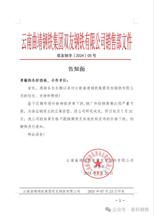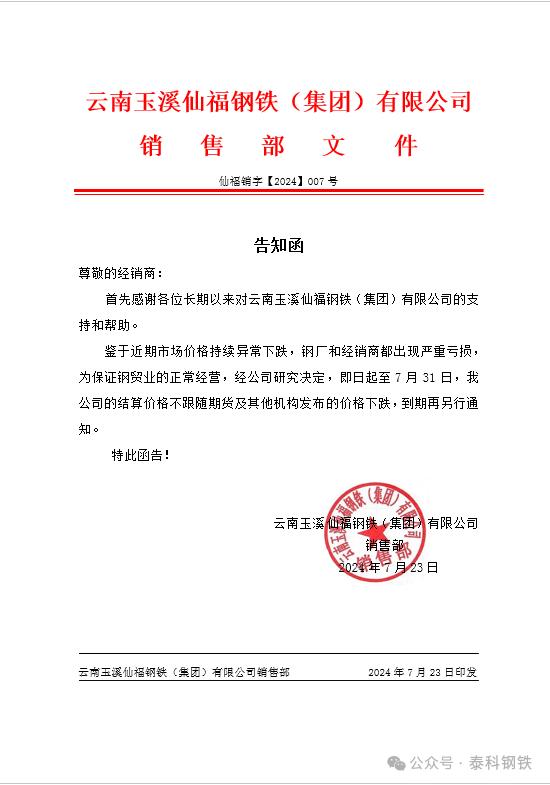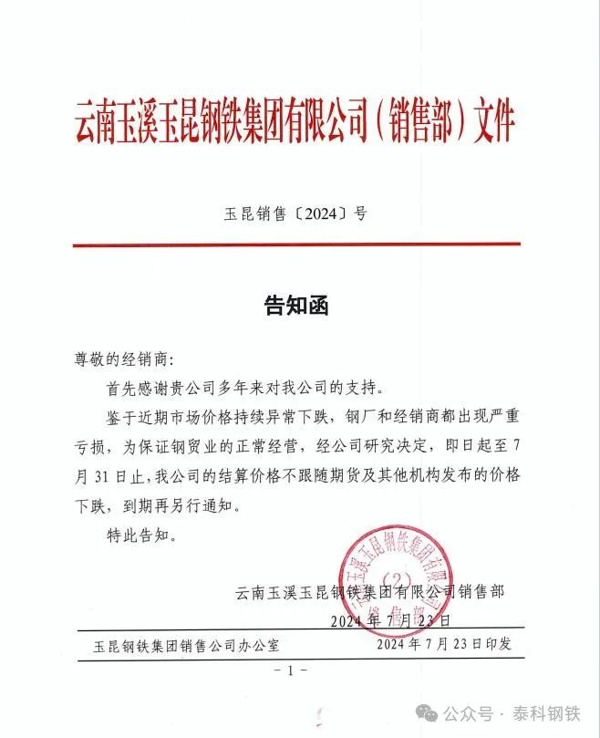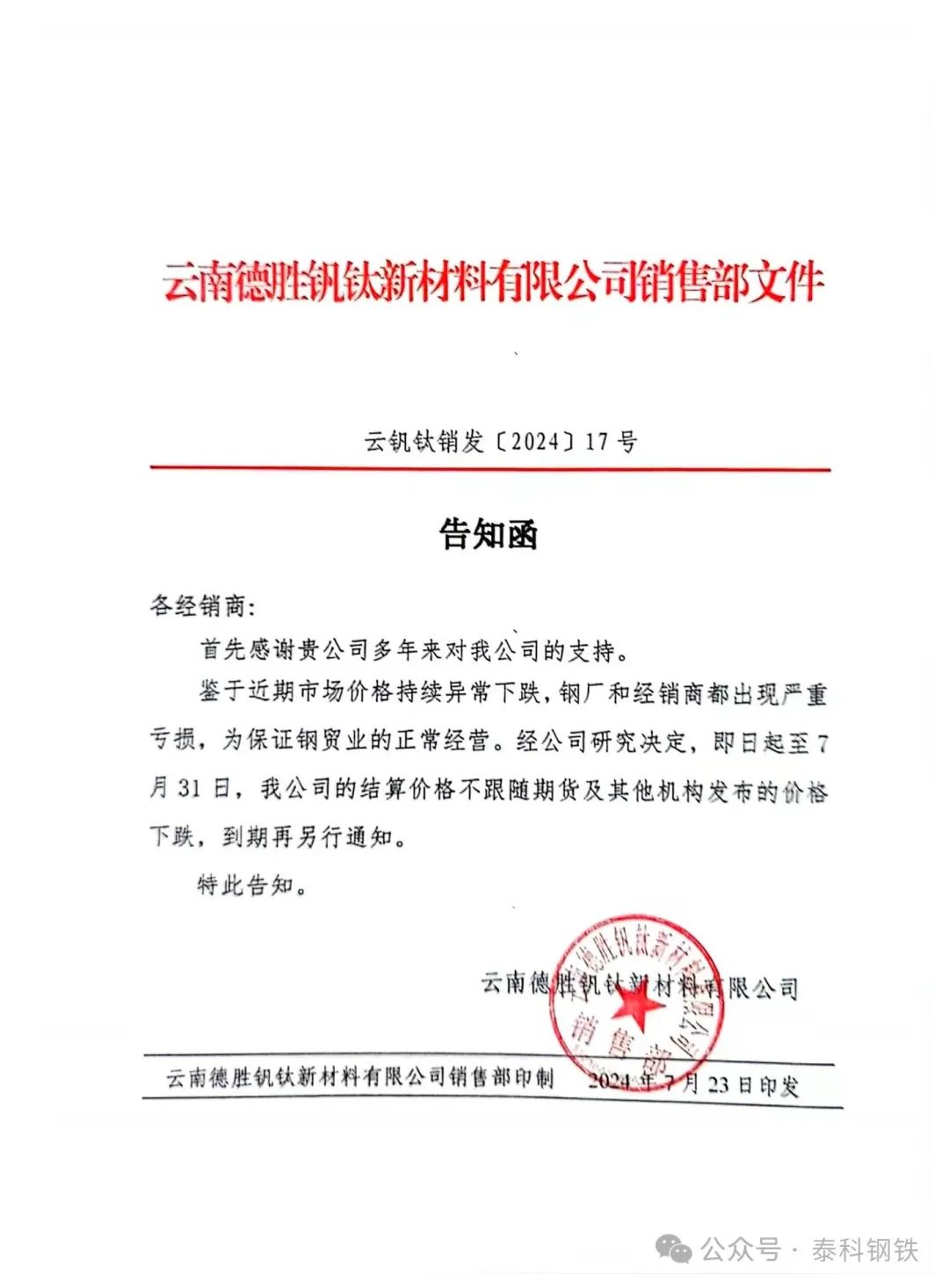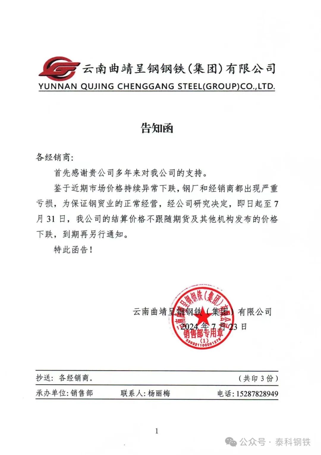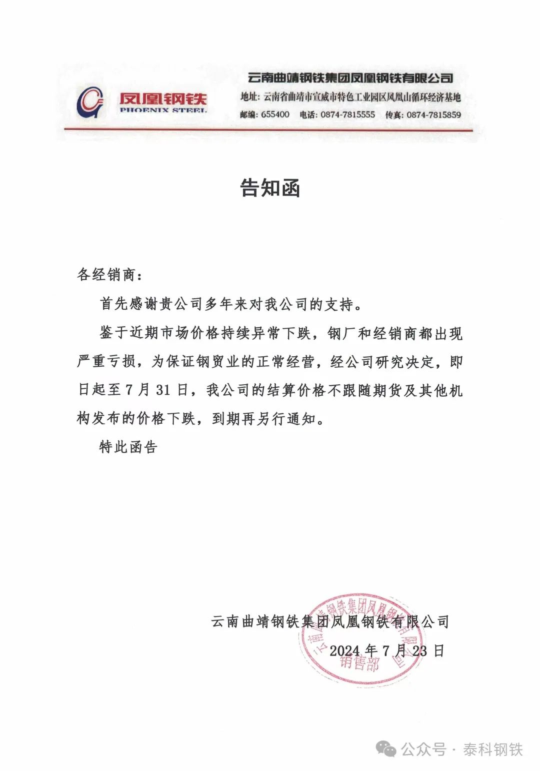 鋼廠紛紛發(fā)聲?。¤b于近期市場價格持續(xù)異常下跌,鋼廠和經(jīng)銷商都出現(xiàn)嚴重虧損,為保證鋼貿(mào)業(yè)的正常經(jīng)營,經(jīng)研究決定,即日起至7月31日,我公司的結(jié)算價格不跟隨期貨及其他機構(gòu)發(fā)布的價格下跌,到期再另行通知!