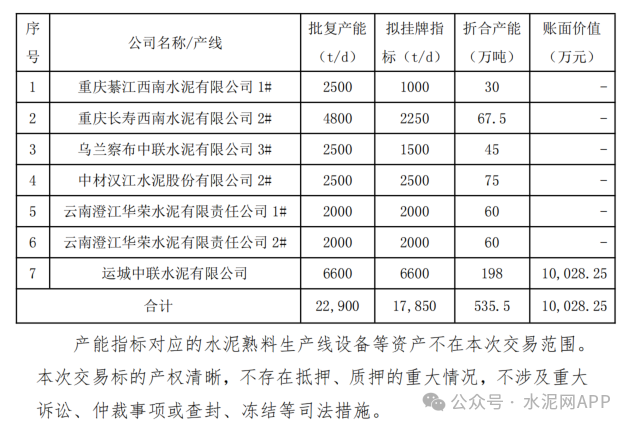 12月12日晚,天山股份發(fā)布公告稱,為最大程度發(fā)揮現(xiàn)有產(chǎn)能價值,結(jié)合生產(chǎn)線實際情況,公司所屬子公司擬將下屬7條水泥熟料生產(chǎn)線的產(chǎn)能指標(biāo)以公開掛牌方式進行轉(zhuǎn)讓,擬掛牌的產(chǎn)能指標(biāo)合計17,850t/d,折合535.5萬噸,轉(zhuǎn)讓金額合計約29,752.65 萬元。