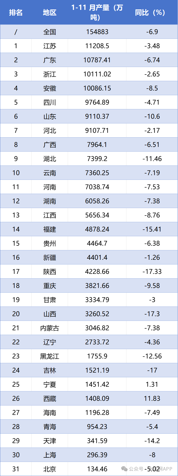 據(jù)國家統(tǒng)計局?jǐn)?shù)據(jù)顯示,1-11月全國水泥產(chǎn)量154883萬噸,同比下降6.9%。從分省市數(shù)據(jù)來看,1-11月,江蘇以產(chǎn)量11208.50萬噸位列第一,廣東產(chǎn)量10787.41萬噸排在第二,浙江產(chǎn)量10111.02萬噸排在第三。同比方面,全國僅西藏、寧夏上升,其余地區(qū)下降,其中陜西降幅最大為 17.33%。