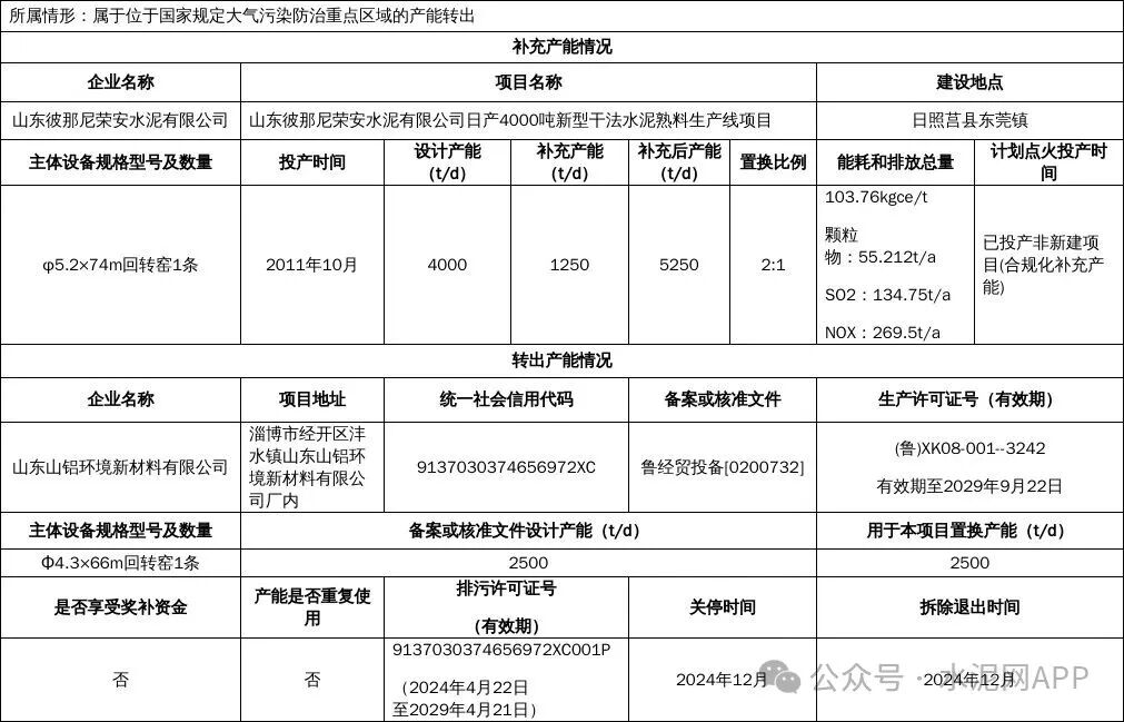 置換方案顯示,山東山鋁環(huán)境新材料公司退出一條2500t/d熟料生產(chǎn)線,產(chǎn)能用于補(bǔ)充山東彼那尼榮安水泥一條4000t/d熟料線,補(bǔ)齊后產(chǎn)能5250t/d,置換比例2:1。