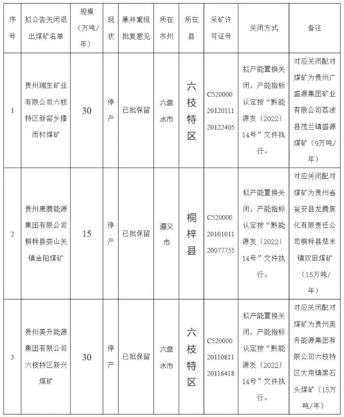 根據(jù)《國(guó)務(wù)院關(guān)于煤炭行業(yè)化解過(guò)剩產(chǎn)能實(shí)現(xiàn)脫困發(fā)展的意見(jiàn)》(國(guó)發(fā)〔2016〕7號(hào))、《關(guān)于加快推進(jìn)兼并重組煤礦分類處置促進(jìn)煤炭產(chǎn)業(yè)轉(zhuǎn)型升級(jí)發(fā)展的通知》(黔能源煤炭〔2020〕100號(hào))、《省能源局關(guān)于進(jìn)一步做好煤炭產(chǎn)能置換工作的通知》(黔能源發(fā)〔2022〕14號(hào))等文件精神,依企業(yè)申請(qǐng),經(jīng)屬地政府同意,現(xiàn)按程序?qū)?jīng)煤礦主體企業(yè)申請(qǐng)的2024年第五批(前四批以原省煤炭產(chǎn)業(yè)結(jié)構(gòu)戰(zhàn)略性調(diào)整工作領(lǐng)導(dǎo)小組辦公室名義公示)擬關(guān)閉煤礦名單進(jìn)行公示(見(jiàn)下表),公示時(shí)間:2024年7月24日至2024年7月31日,凡對(duì)公示內(nèi)容有異議者,請(qǐng)?jiān)诠酒趦?nèi)以書面形式向省能源局反映(聯(lián)系電話:0851—86891303)。