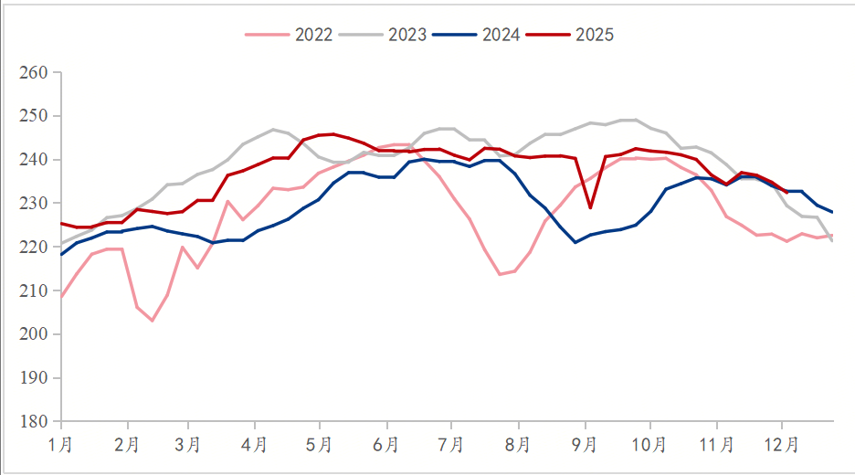 下游焦化產能被動出清,4.3米焦爐產能2026年繼續(xù)落地產能淘汰計劃,關停約2755萬噸,但焦炭總產能仍過剩,行業(yè)低利潤常態(tài)化抑制煉焦煤需求釋放。鋼廠利潤持續(xù)承壓,螺紋鋼即期利潤收縮至成本線邊緣,3145元/噸成為螺紋05合約壓力位。鋼廠通過檢修減產控制產量,12月份鐵水降至232萬噸/日,倒逼原料采購謹慎,焦炭三輪提降預期即是利潤傳導壓力的體現(xiàn)。