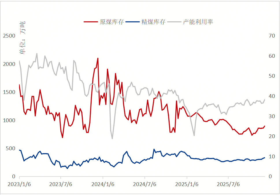 從上游端庫存的角度看,2025年煤礦端開工率保持平穩(wěn)波動,除一月份農歷春節(jié)假期外整體開工率在80%區(qū)間內窄幅震蕩波動運行。2025年均值為84.28%略低于2024年的86.15%,據Mysteel調研數(shù)據顯示,全國314家洗煤廠樣本全年平均開工率為34.48%,同比減少6.02%。而庫存方面也能看到較去年小幅減少,全年平均水平相較2024年低10萬噸左右。截至2025年12月中旬,據Mystee調研數(shù)據顯示,全國314家洗煤廠樣本原煤庫存893.92萬噸,同比減少303.78萬噸,降幅25.36%;精煤庫存332.37萬噸,同比減少113.01萬噸,降幅25.37%。2025年,旺季不旺,淡季不淡的特征導致洗煤廠庫存整體高位逐漸回落,精煤維持安全庫存區(qū)間。
