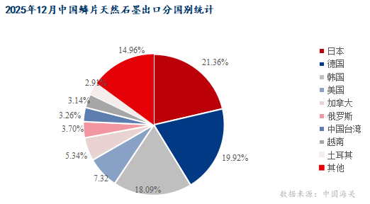 2025年12月天然鱗片石墨出口6867.889噸,其中日本出口量最大為1466.725噸,占總比重的21.36%,其次是德國(guó)出口量為1368.003噸,占總比重的19.92%,其他貿(mào)易伙伴出口量總共占比為14.96%。