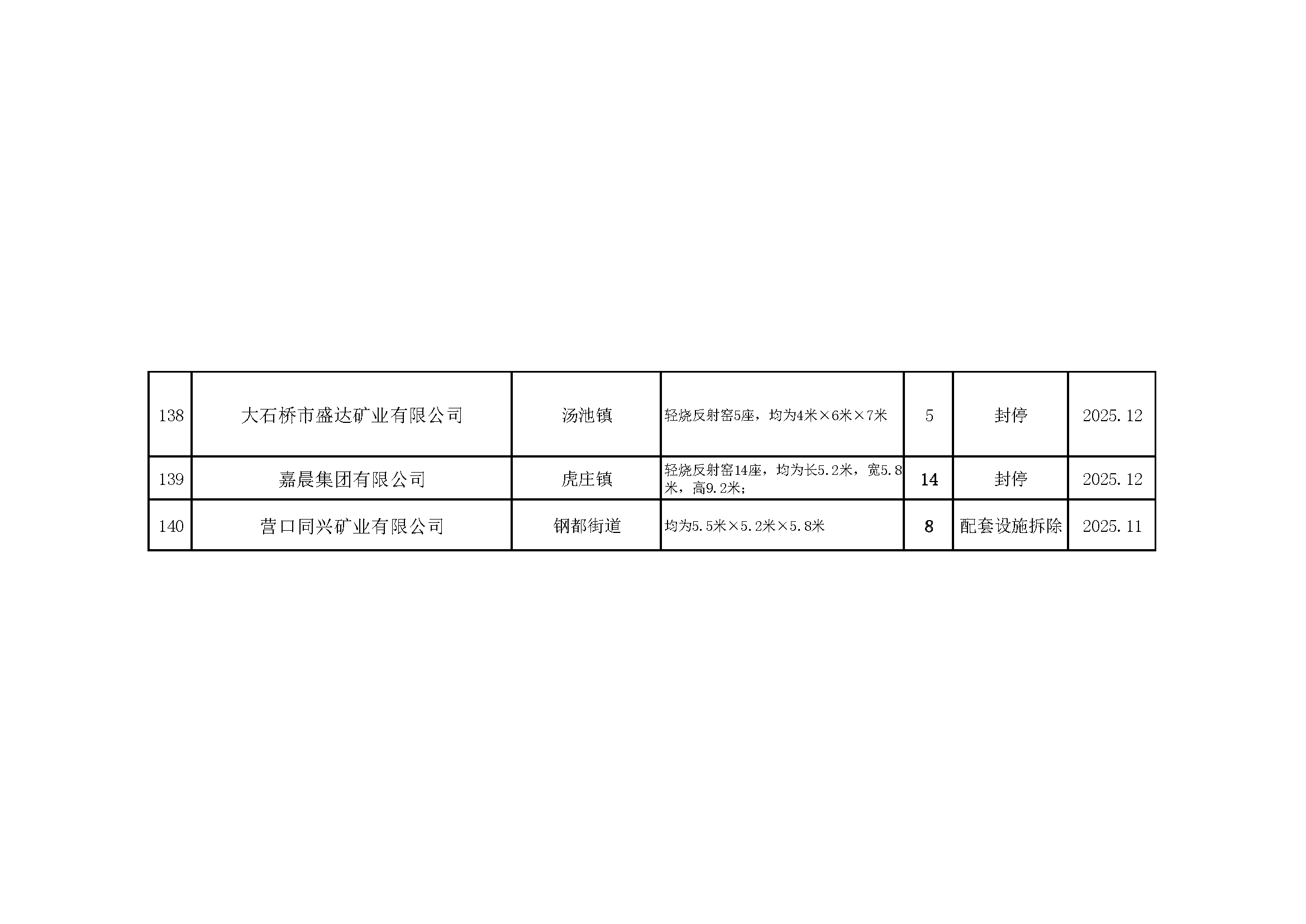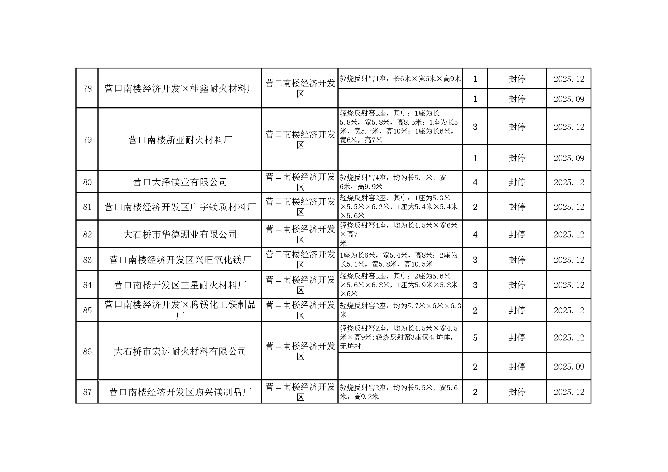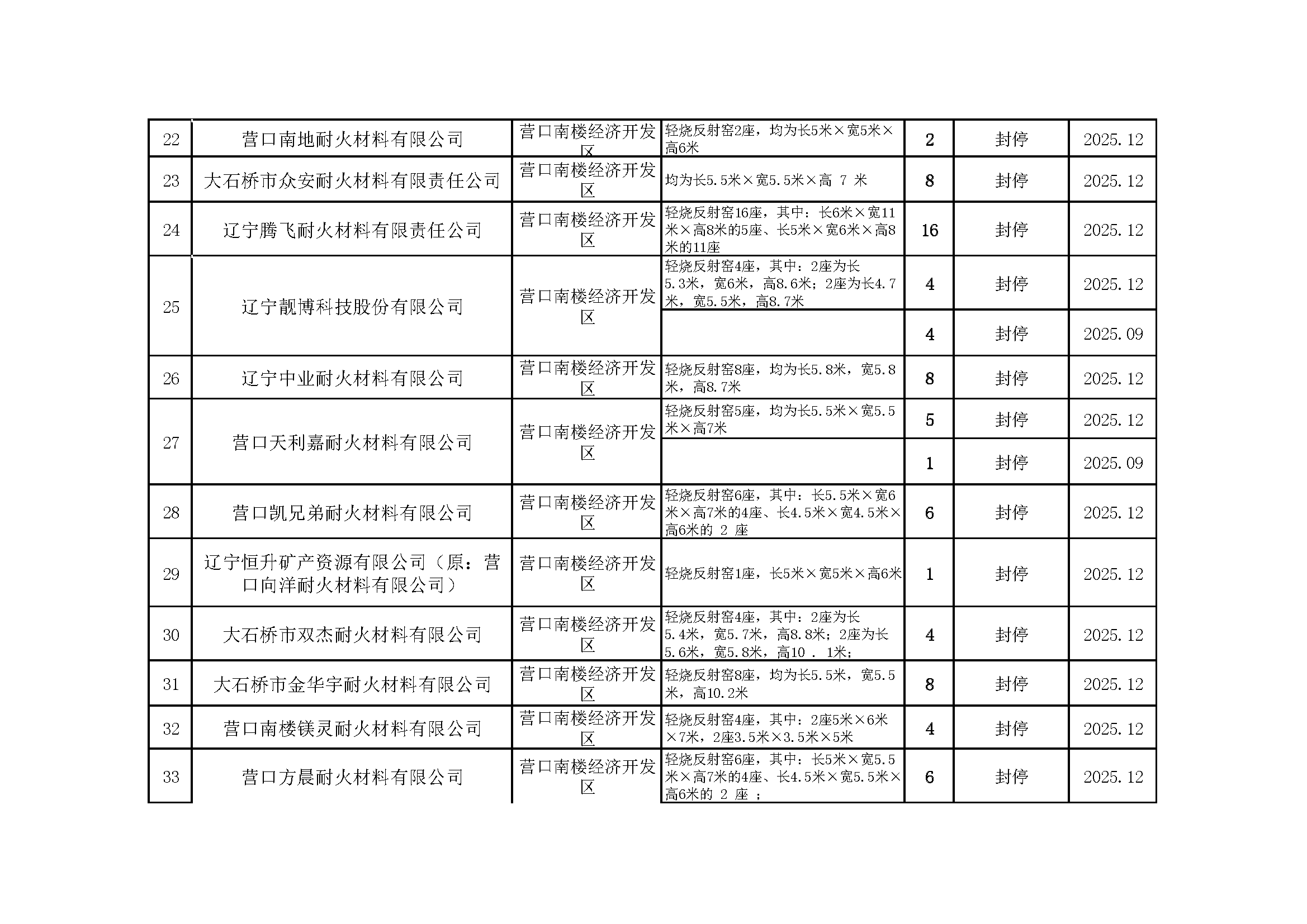 依據(jù)《遼寧省人民政府辦公廳關(guān)于推進(jìn)菱鎂行業(yè)高質(zhì)量發(fā)展的實(shí)施意見》(遼政辦發(fā)〔2023〕15號(hào))及《遼寧省輕燒反射窯淘汰工作方案》(遼工信建材〔2024〕18號(hào))要求,我市對(duì)轄區(qū)內(nèi)輕燒反射窯開展封停淘汰工作。截至2026年1月31日,全部核驗(yàn)完畢,現(xiàn)將相關(guān)淘汰情況予以通告,接受社會(huì)監(jiān)督。企業(yè)或個(gè)人若對(duì)淘汰工作有異議,可如實(shí)反映有關(guān)情況。
