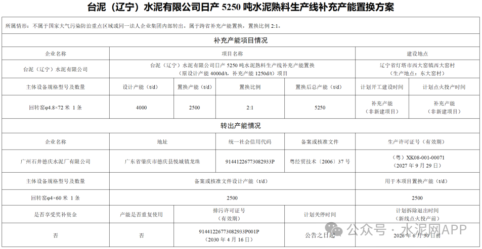 置換方案顯示,臺(tái)泥(遼寧)水泥4000t/d熟料生產(chǎn)線補(bǔ)充產(chǎn)能1250t/d,補(bǔ)齊后產(chǎn)能5250t/d,退出產(chǎn)能來(lái)自廣州石井德慶水泥一條2500t/d生產(chǎn)線,置換比例2:1。