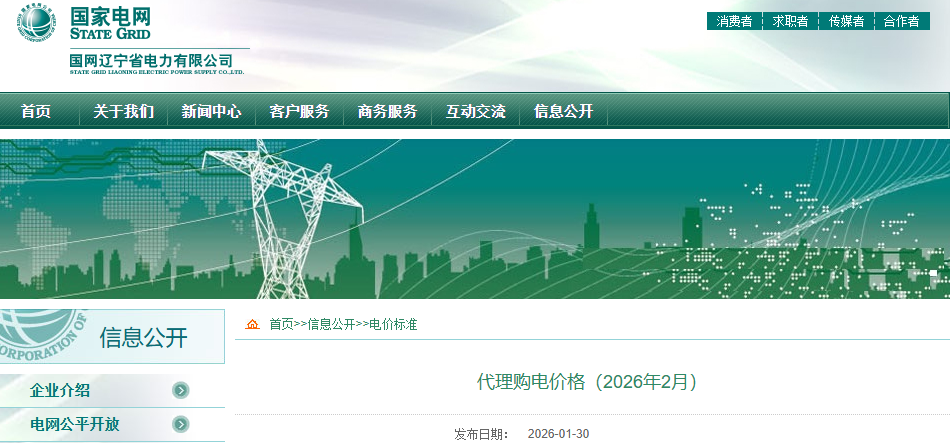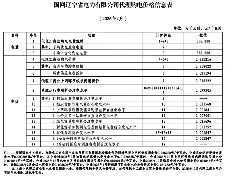 國(guó)網(wǎng)遼寧省電力有限公司代理購(gòu)電工商業(yè)用戶電價(jià)表(2026年2月)