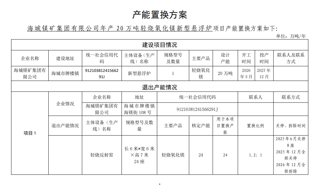 附件:海城鎂礦集團(tuán)有限公司產(chǎn)能置換方案