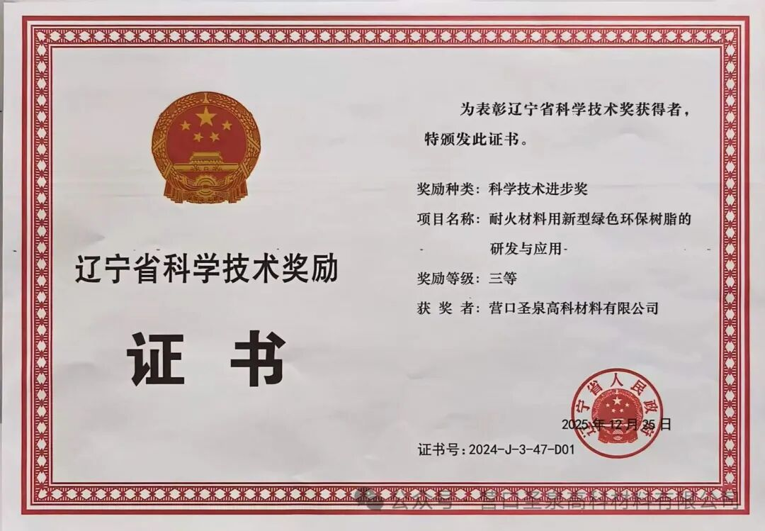 近日,營(yíng)口圣泉高科材料有限公司憑借耐火材料用新型綠色環(huán)保樹(shù)脂的研發(fā)與應(yīng)用項(xiàng)目,成功榮獲遼寧省科學(xué)技術(shù)進(jìn)步三等獎(jiǎng)。