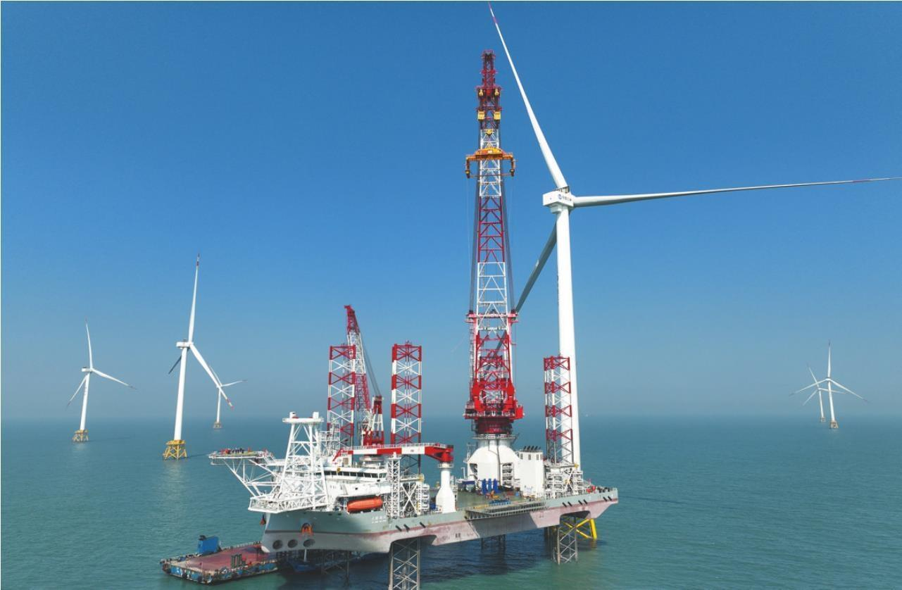2月5日,20兆瓦海上風(fēng)電機(jī)組在閩南海域完成調(diào)試,成功并網(wǎng)發(fā)電。該20兆瓦海上風(fēng)電機(jī)組吊裝、調(diào)試、并網(wǎng),標(biāo)志著我國(guó)超大容量機(jī)組研發(fā)制造、海上施工及運(yùn)營(yíng)能力再上新臺(tái)階。圖為在閩南海域拍攝的20兆瓦海上風(fēng)電機(jī)組和“大橋海風(fēng)”號(hào)2000噸自升式海上風(fēng)電安裝平臺(tái)。
