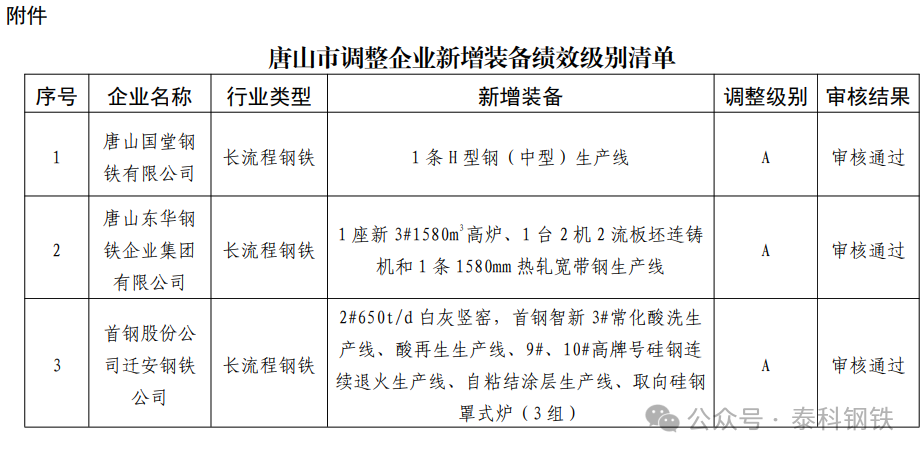 根據(jù)《河北省鋼鐵等7個(gè)重點(diǎn)行業(yè)環(huán)??冃?chuàng)A審核評定管理辦法(試行)》,經(jīng)企業(yè)申請、市級初審、省級審核等程序,你市唐山國堂鋼鐵有限公司、唐山東華鋼鐵企業(yè)集團(tuán)有限公司、首鋼股份公司遷安鋼鐵公司等3家企業(yè)新增裝備評定為重點(diǎn)行業(yè)環(huán)保績效A級。